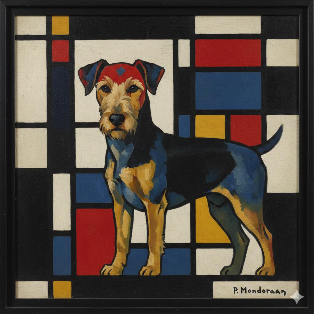 Bold Mondrian-inspired geometric portrait with primary color blocks and black grid lines.